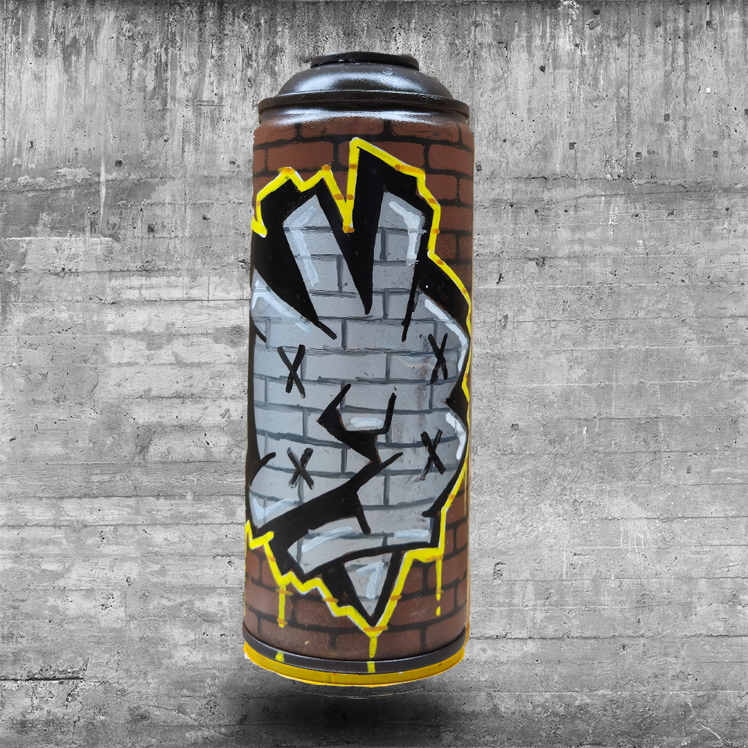 Jede Sprühdose ist ein Unikat: Mit Sprüh- und Acrylfarbe bemalt, nummeriert und auf der Bodenseite handsigniert. Außerdem mit glänzendem Klarlack versiegelt.